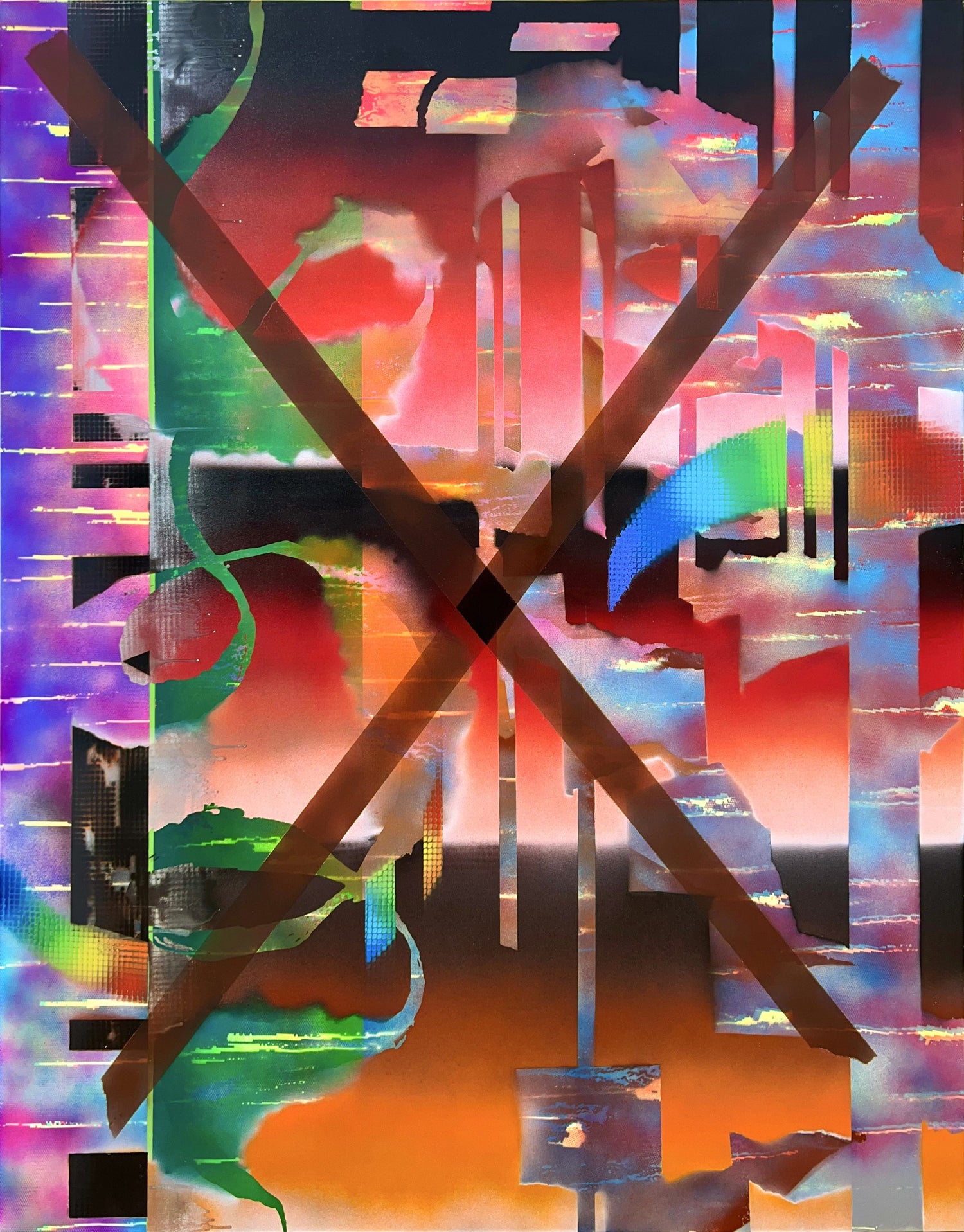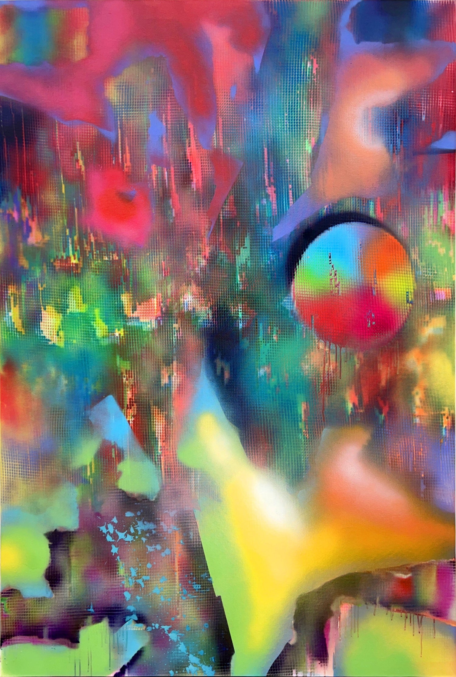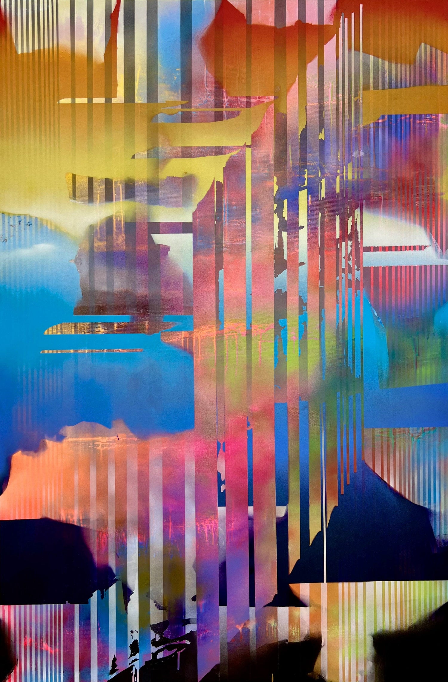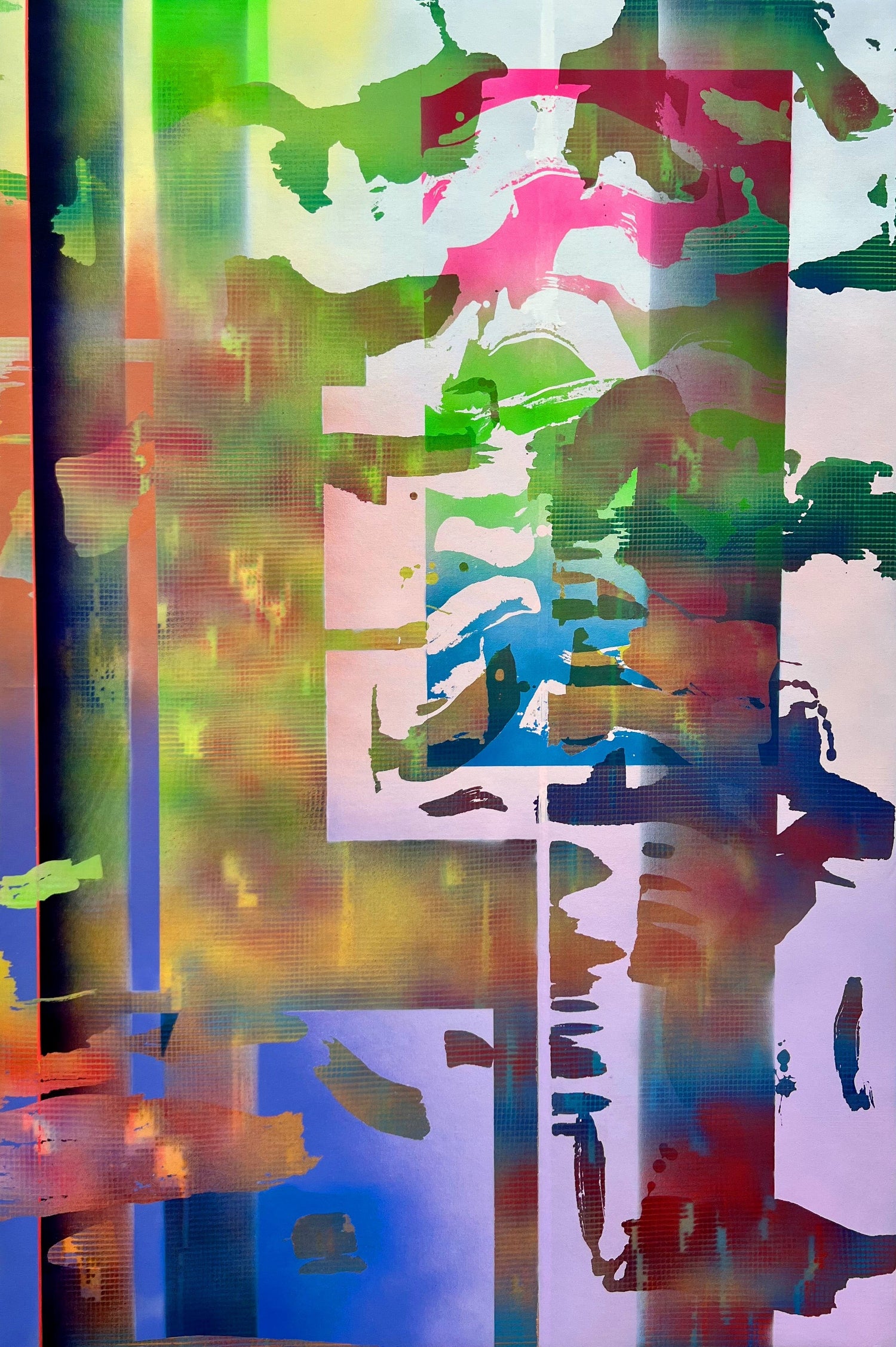 This series of paintings describe the transverse feeling of inhabiting both our online and offline spaces, and the sensory and mental overload of rapidly switching from one to the other. My canvas offers familiar Web-like graphics, and then interrupts them: with no assigned compositional hierarchy, the layers cut and disrupt one another, achievening the most human tendency tech shows: a glitch, a computer bug, a lag.