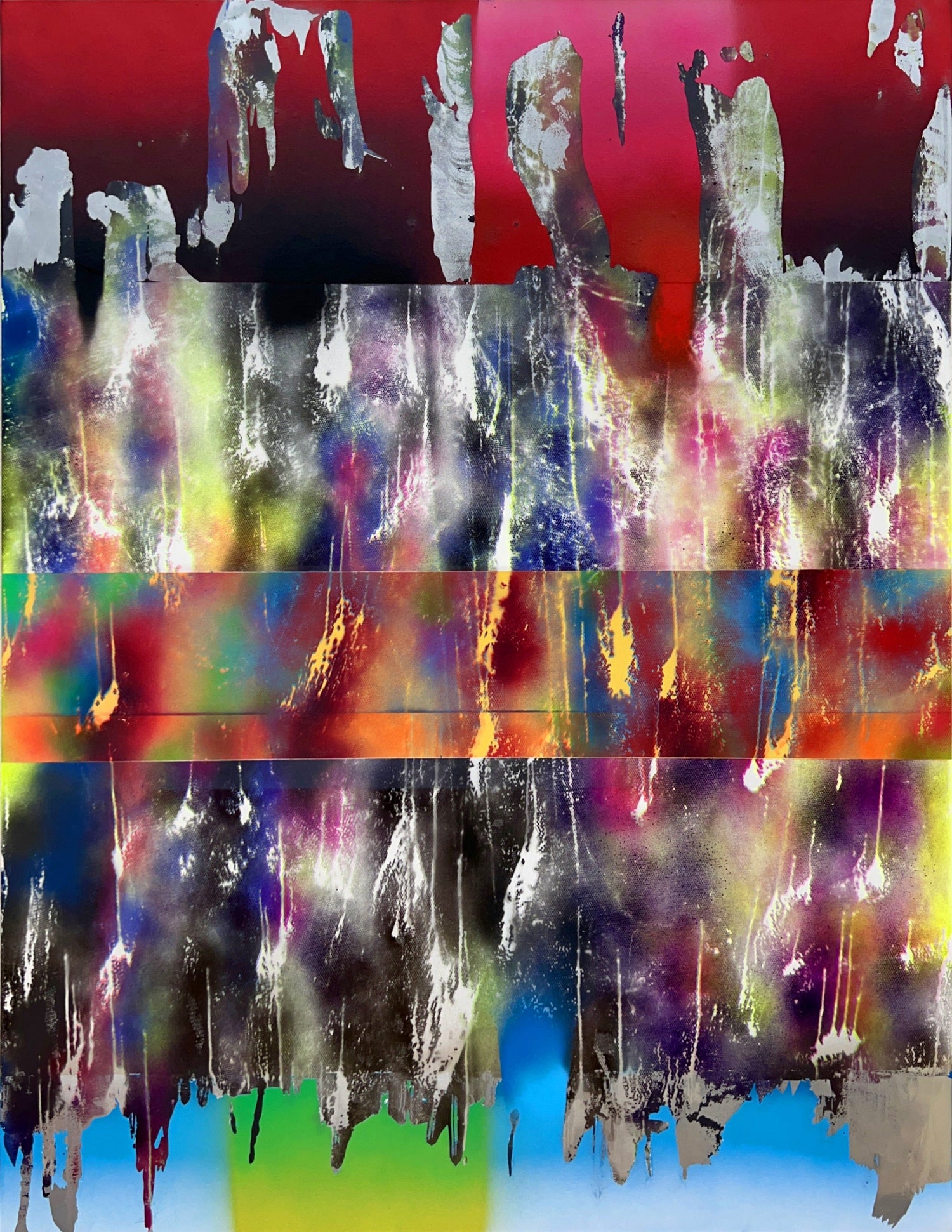The Undo function negates the last command done on a computer interface. With it we gain timelessness, a licence to be messy and take risks while interacting with software. Created as a physical ode to digital graphics, Undo neatly layers attractive patterns but forgoes any compositional hierarchy: the planes obscure and cut into one another, scraped off in playful “eraser” marks. With no steps backwards to go, the canvas is preserving the illusion of perpetuity by being limited: a disrupted arrangement, a permanent transient state.
