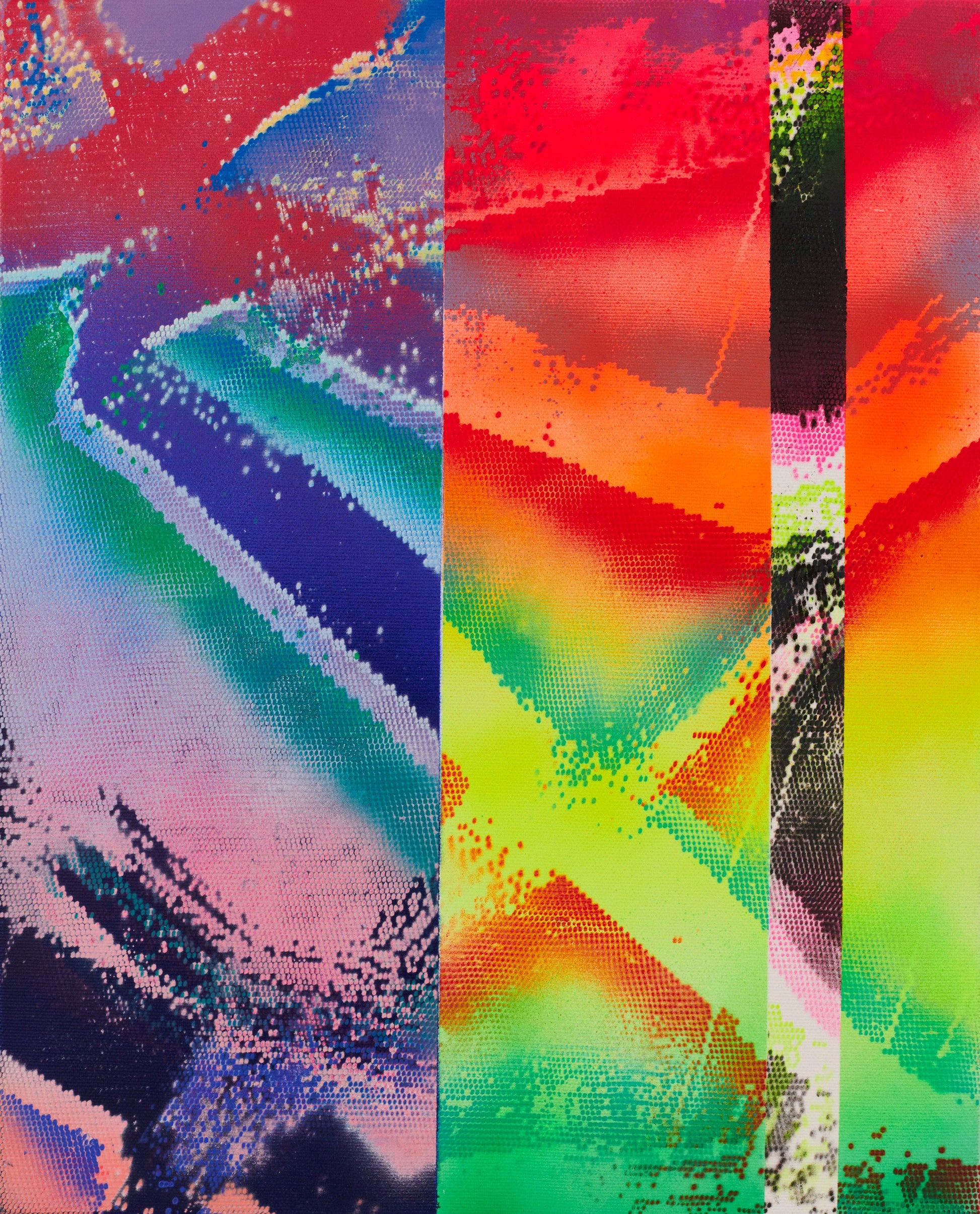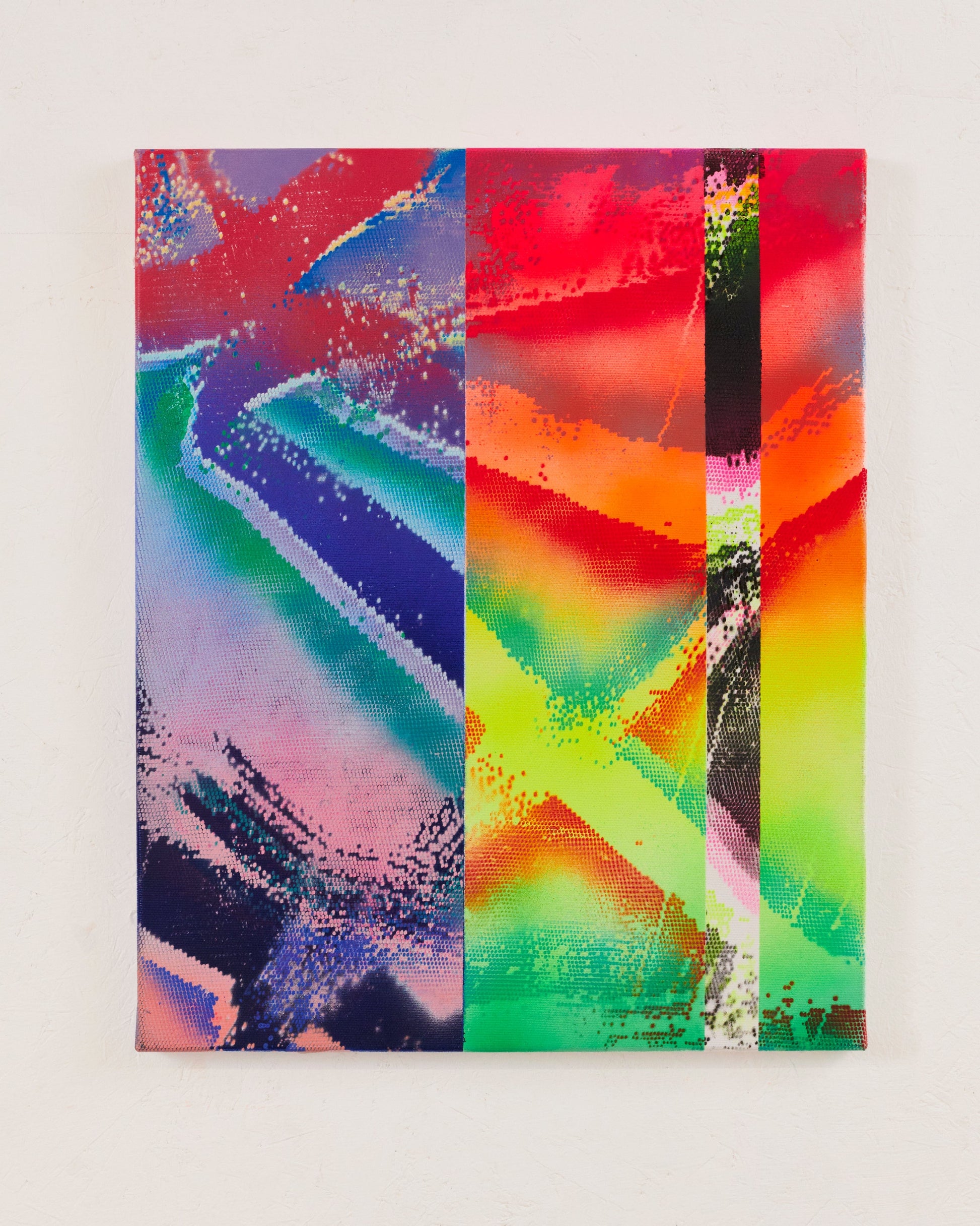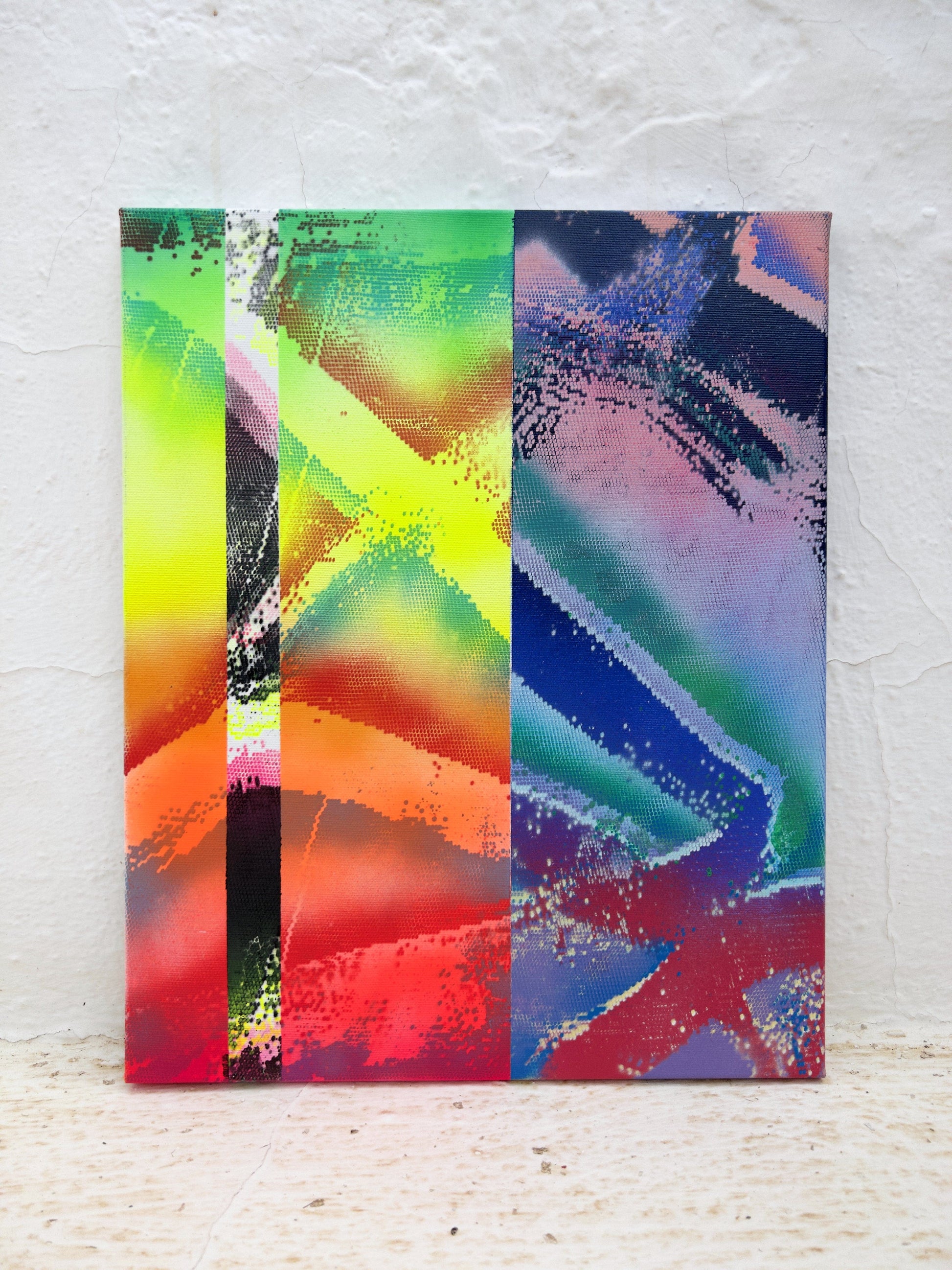 The Flighty canvases subtly satirise our modern inclination to seek high-definition experiences in virtual realms, inadvertently diverting our attention from the authentic and irreplaceable moments of our lives. To capture the visual essence of a screen, the artist employed a distinctive technique, utilising spray paint through a netting, pre-painted in latex. This method results in a piece that not only showcases trust in the medium but also embraces the serendipitous drips and accidents that arise. Flighty invites viewers to reflect upon the inherent value and richness found in fully immersing ourselves in the present moment.