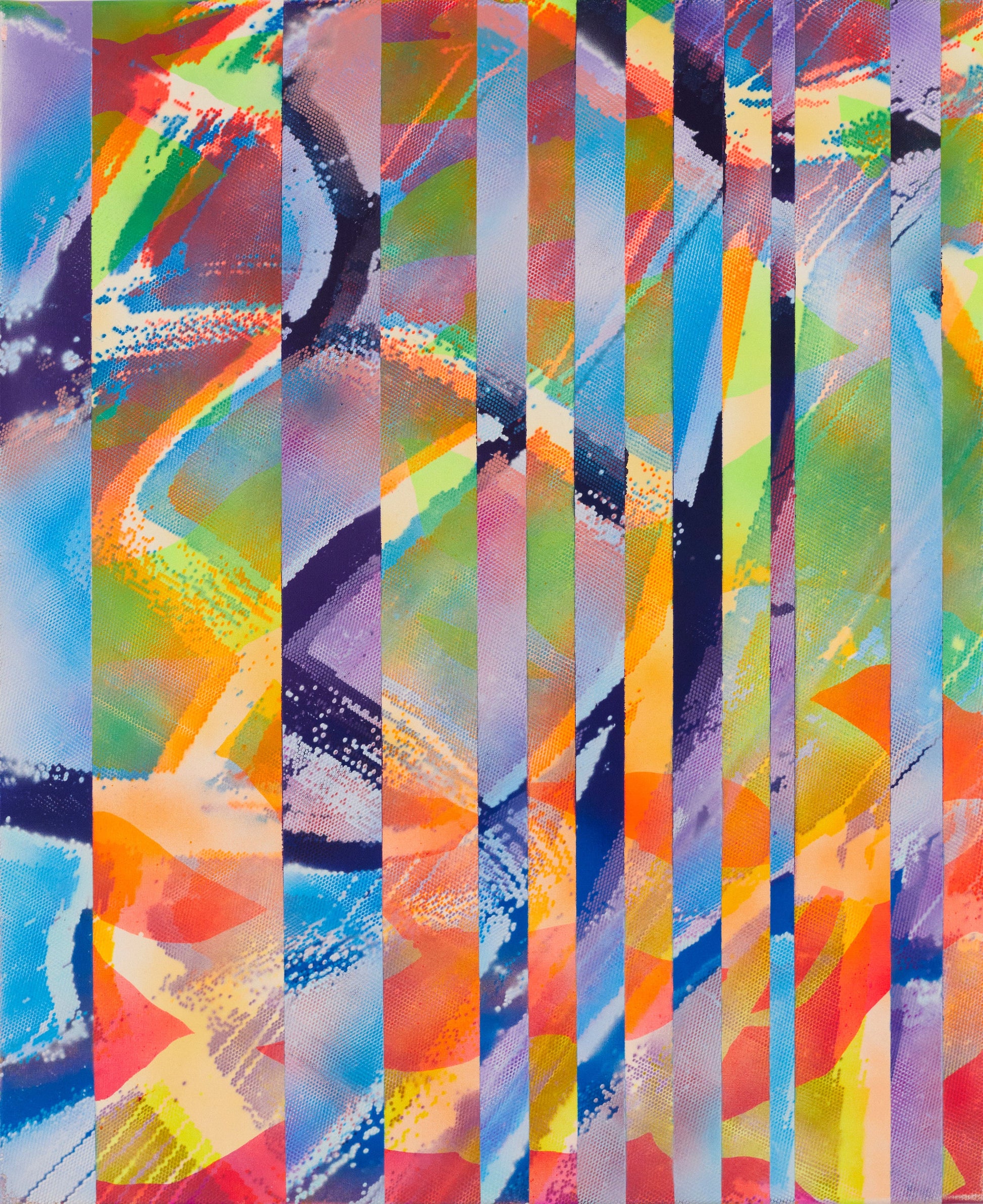 The Scatterbrain paintings encapsulate the contemporary compulsion to simultaneously navigate our various online realms, profiles, and media. Opening one app inevitably leads to checking another, and while engrossed in the big screen, we feel the incessant need to ensure we're not missing out on something more captivating on the smaller screen. This constant spiral between virtual spaces scatters our attention and dilutes our experience of the present moment. Within this painting, the viewer is invited to illuminate their own inclination to spiral and escape the here and now, by focusing their gaze on the deliberate brushstrokes that unearth layers upon layers of brilliant colour, mirroring the immersive screen experience. The sharp vertical transitions into negative colour formats punctuate the distortion of the imaginary digital space, creating a visual rhythm reminiscent of scrolling through endless content.