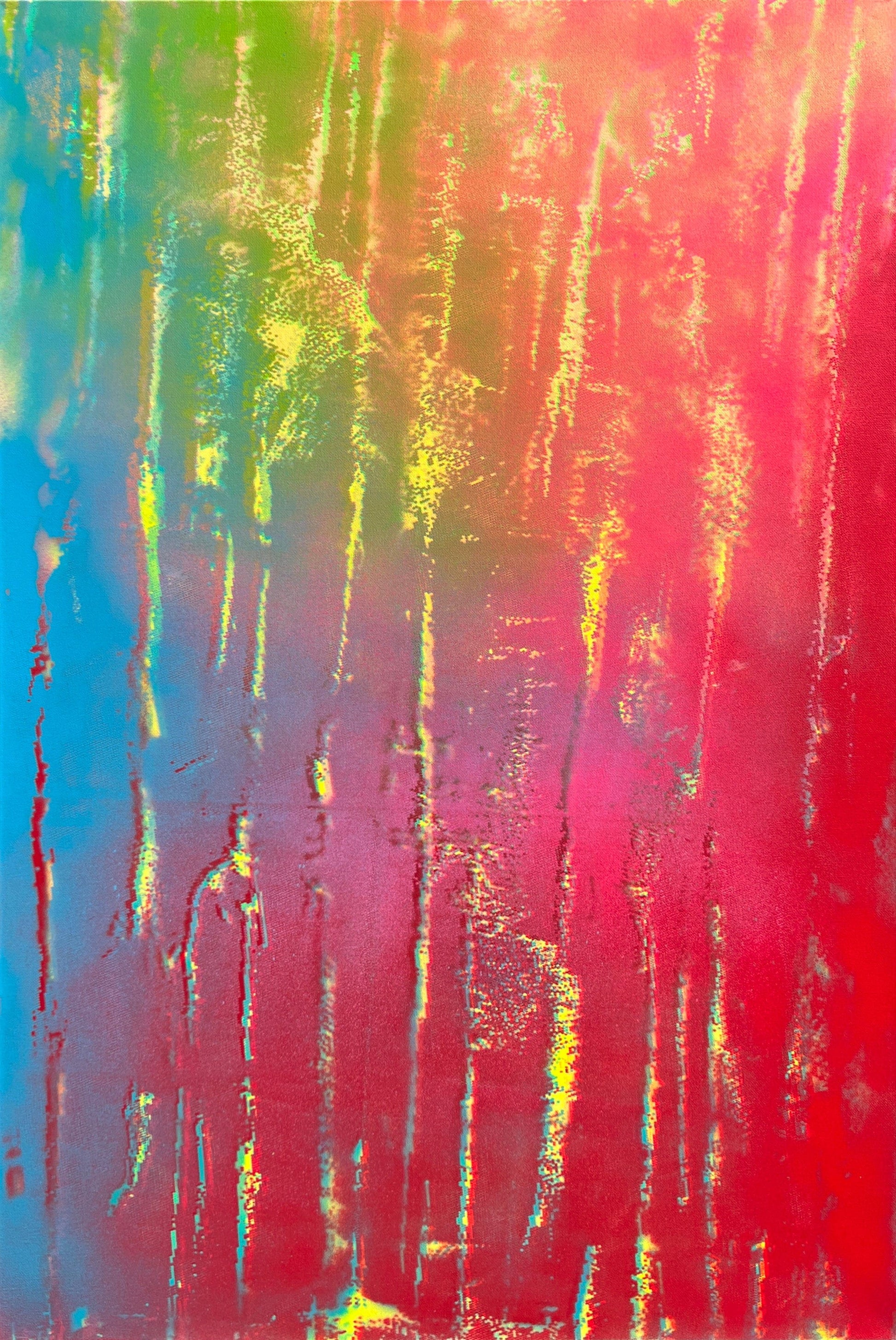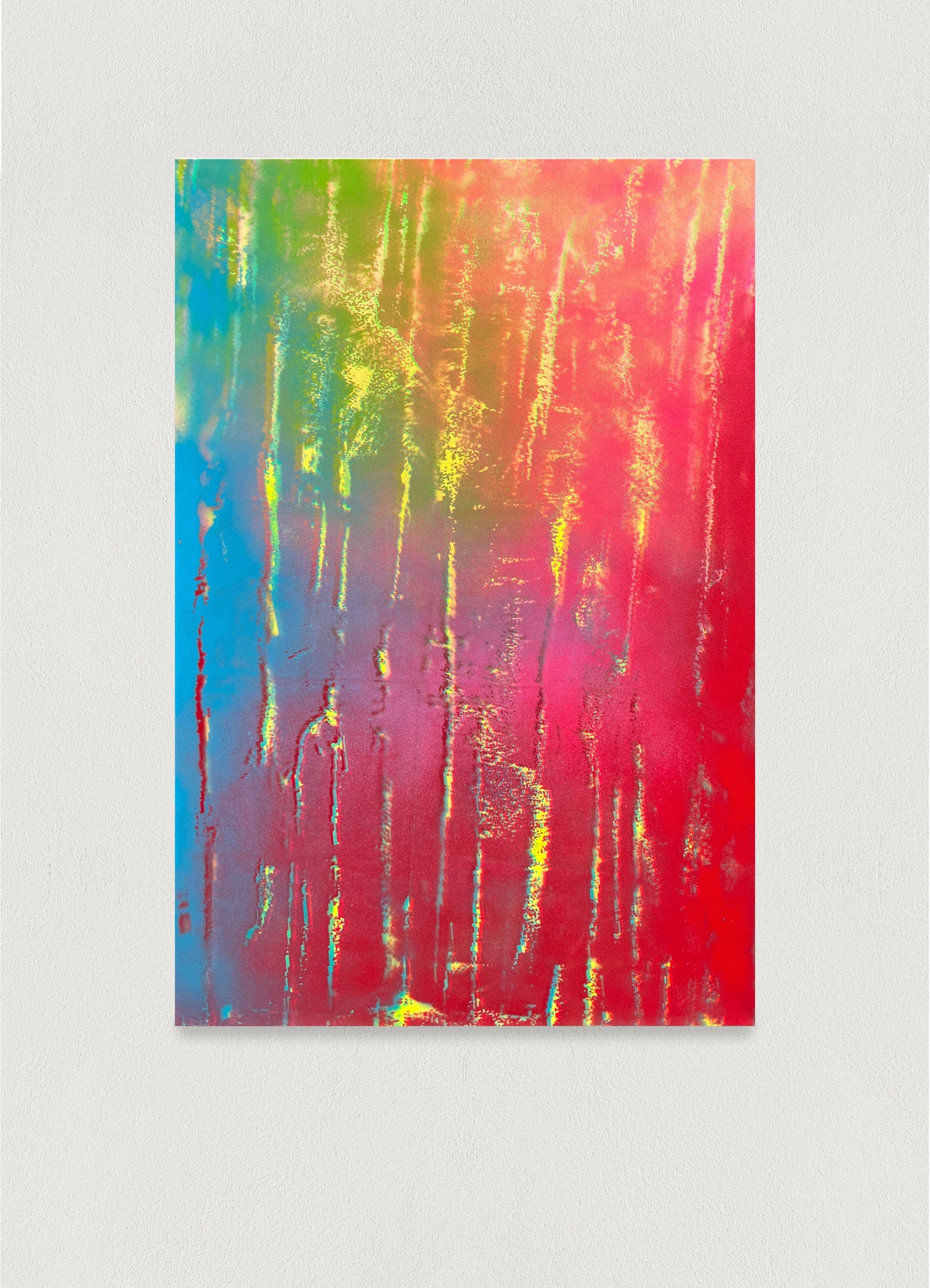It takes a moment for reality to crystallise in full sensory capacity as one turns off their screen. The more our virtual and offline lives interlace, the more of a Pavlovian response we develop to the digital. The screen’s incessant attraction punctuates our visual perception, hooking us with instant gratification, and holding our focus in flux: neither here nor there. Represented by a warm brightness is the “there” we are trained to reach for, peeking through the pixelated curtain of moiré interference drizzling over the canvas’ flatness.
