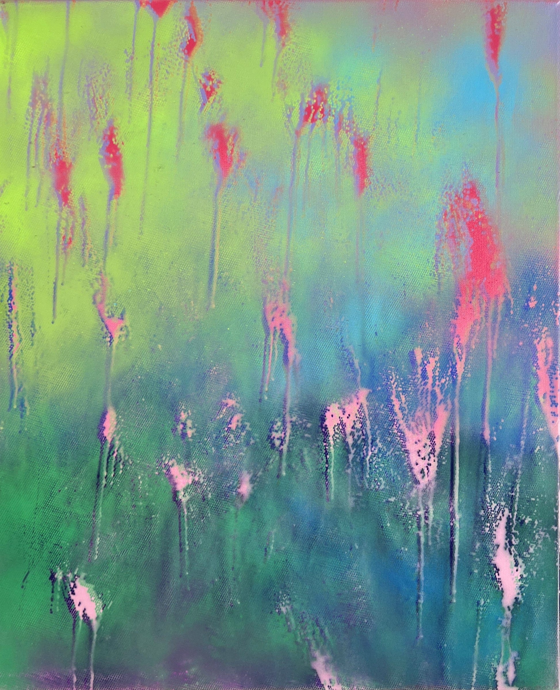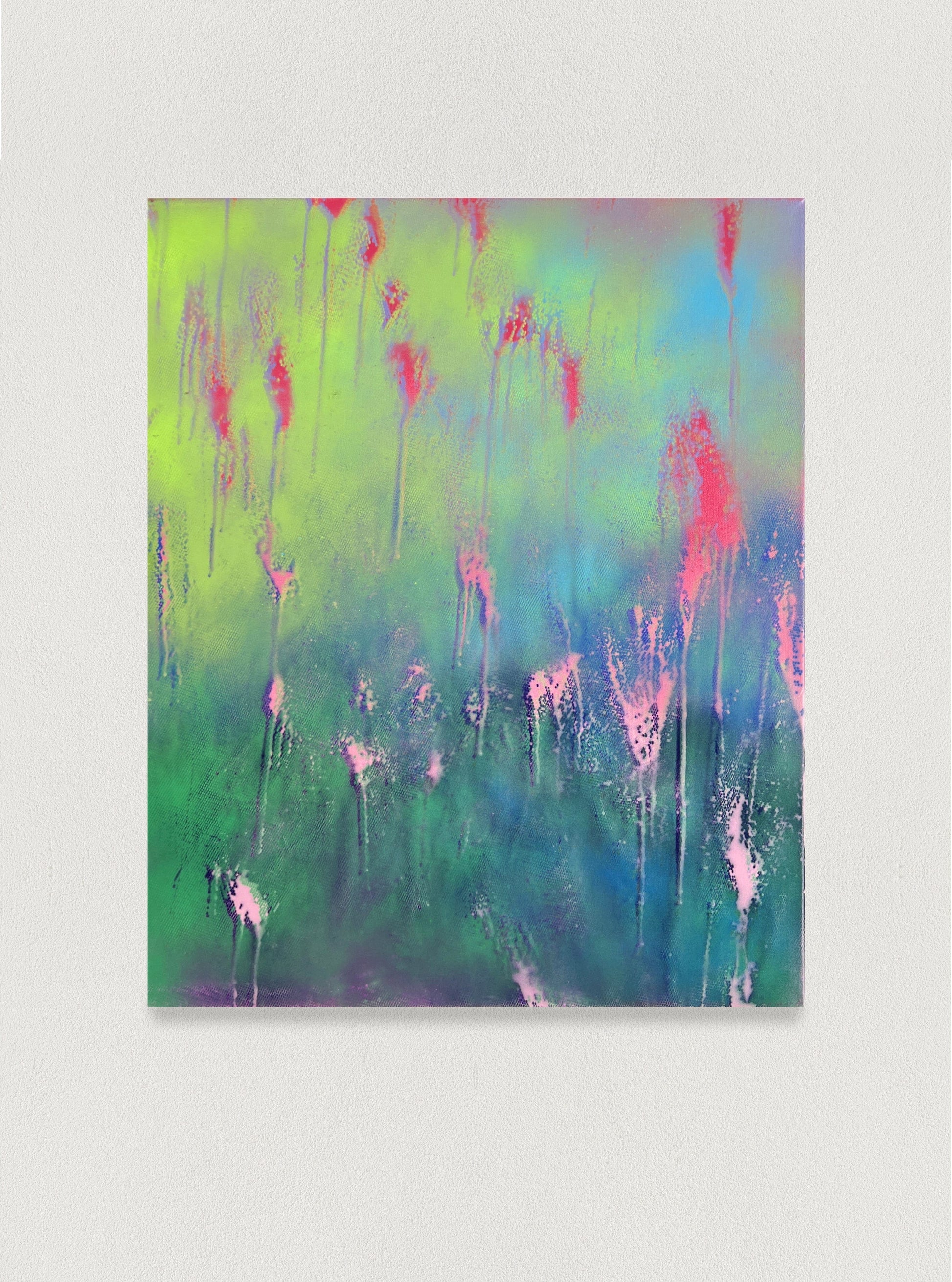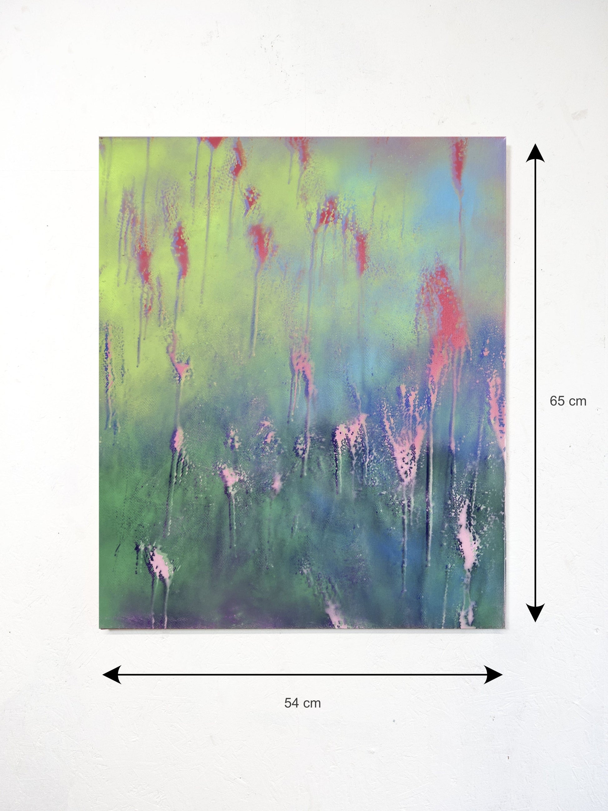 As one turns off their screen, it takes a moment for reality to crystallise, fully engaging our senses. The intertwining of our virtual and offline lives creates a Pavlovian response, ingraining our minds with a conditioned association to the digital realm. To capture the visual essence of a screen, the artist employed a distinctive technique, utilising spray paint through a netting, pre-painted in latex. This method results in a piece that not only showcases trust in the medium but also embraces the serendipitous drips and accidents that arise. Much like real screens, this imaginary screen's allure punctuates our visual perception, holding our focus in a state of flux, caught between two realms. Represented by a warm brightness, we glimpse the elusive "there" we are instinctively trained to reach for, peeking through the pixelated curtain of moiré interference that delicately drizzles over the canvas' flatness.