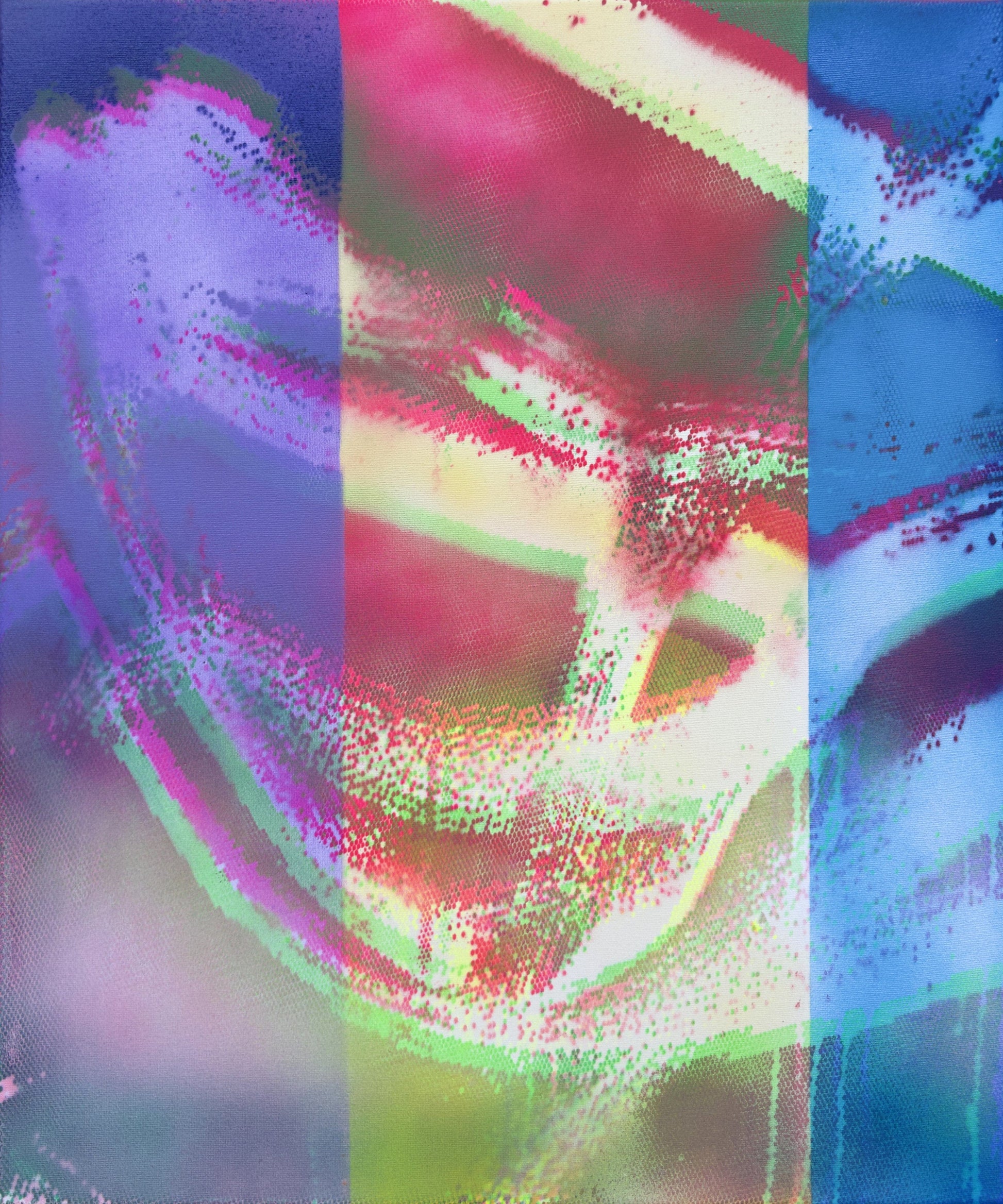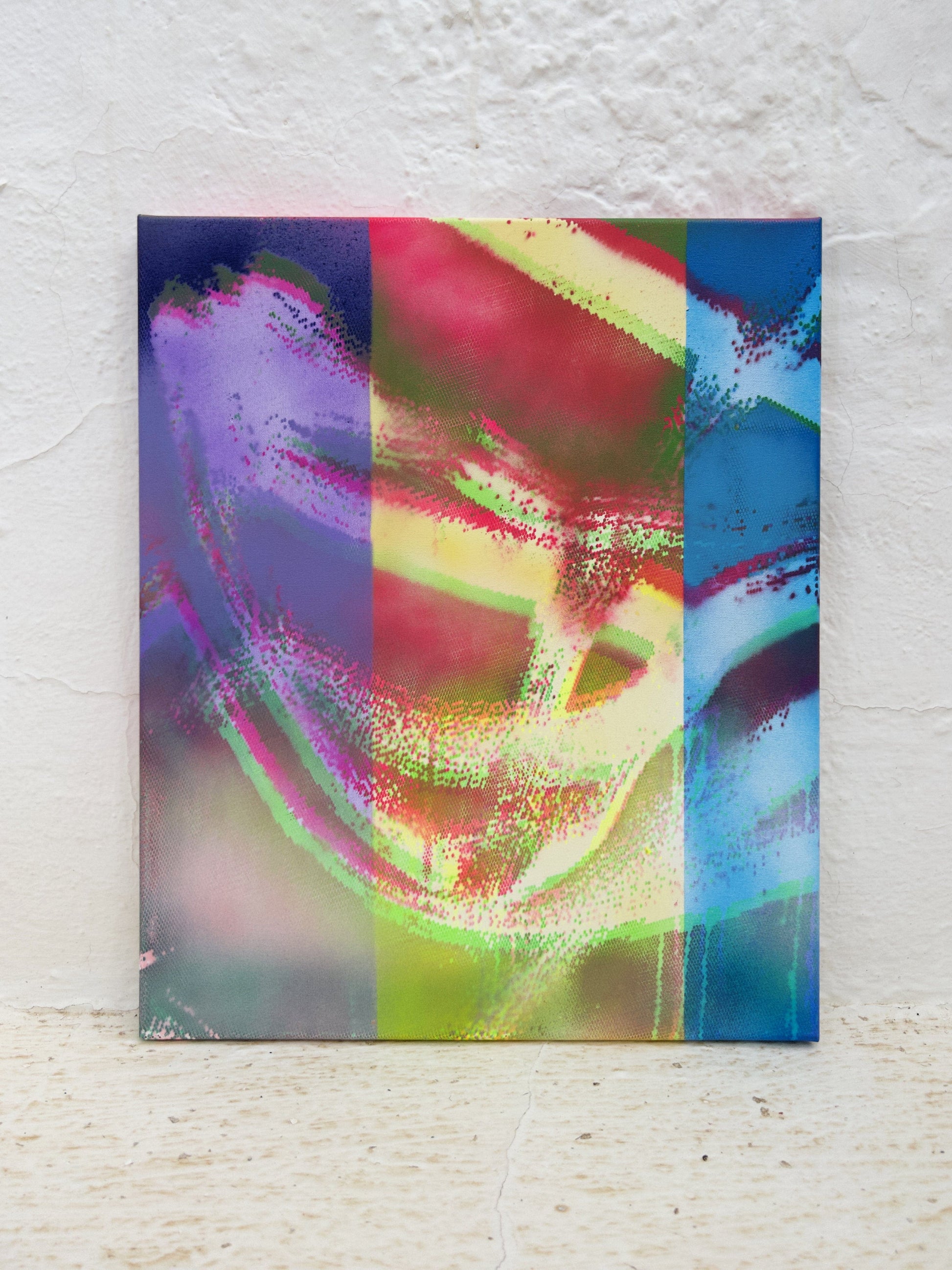 The Wanderer paintings offer a contemporary contemplation of our capacity to maintain focus in a hyperdigital world. The artist employed a distinctive technique, applying spray paint through a pre-painted latex netting, resulting in a composition that shows trust in the medium and embraces the serendipitous drips and accidents that arise. With use of semi-transparent pigments, the artwork retains a gentle yet distinct transition of colours, accompanied by chromatic aberration effects that evoke the dispersal of a computer screen beneath bold brushstrokes. With gentle enthusiasm, this piece invites viewers to wander within its RGB borders, embracing its fluid momentum.